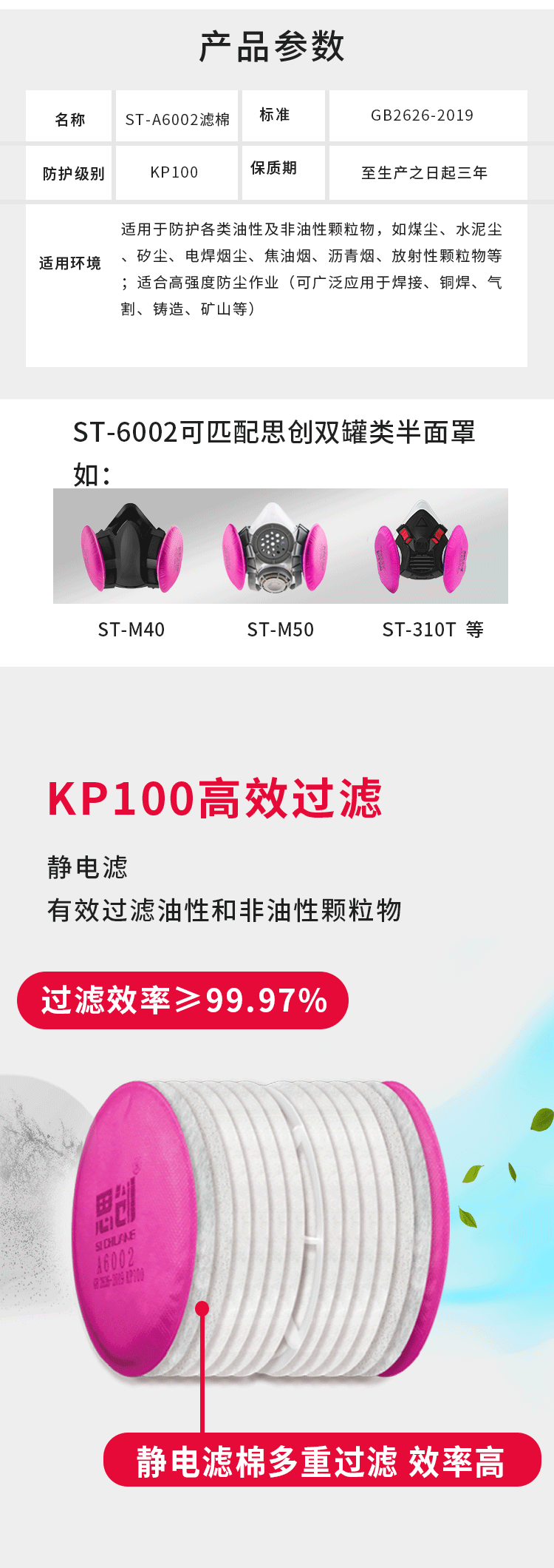 防塵過濾元件,符合GB2626-2019標(biāo)準(zhǔn),對油性及非油性顆粒物過濾效率≥99.97%。 四面進(jìn)氣,防護(hù)面積大,容塵量高; 內(nèi)帶導(dǎo)氣支架,通氣性更好,濾棉利用率更充分,呼吸更順暢; 三角卡扣,可搭配310T、M40-3A、M50G-3A、M60G-3A、M60X-3等半面罩,及S100-1、M90-1系列全面具; 適合于油煙、油霧、瀝青煙、焦?fàn)t煙、柴油尾氣及放射性顆粒物等粉塵防護(hù)。