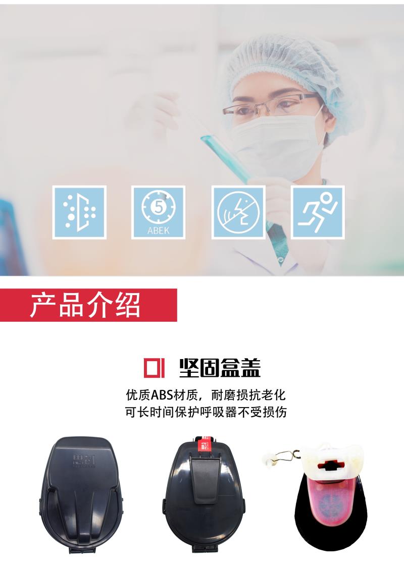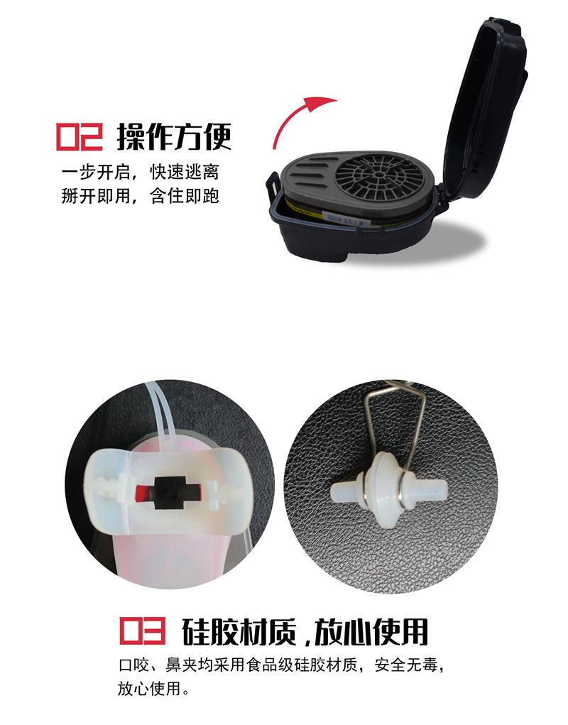 >一步開啟盒蓋,快速逃離,掰開即用,含住即跑; >堅固盒蓋,優(yōu)質ABS材質,耐磨損抗老化,可長時間保護呼吸器不受損傷; >口咬、鼻夾部分采用食品級硅膠材質,放心使用; >ABEK型活性炭,可防護多種氣體; >波紋式鼻夾+彈力彈簧,不打滑,不脫落,有效防止污染入鼻; >隱蔽式呼吸閥,不心慌,跑動中呼吸更順暢;